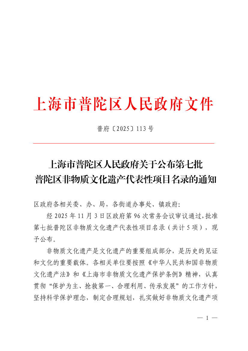经2025年11月3日区政府第96次常务会议审议通过,批准第七批普陀区非物质文化遗产代表性项目名录(共计5项),现予公布。
