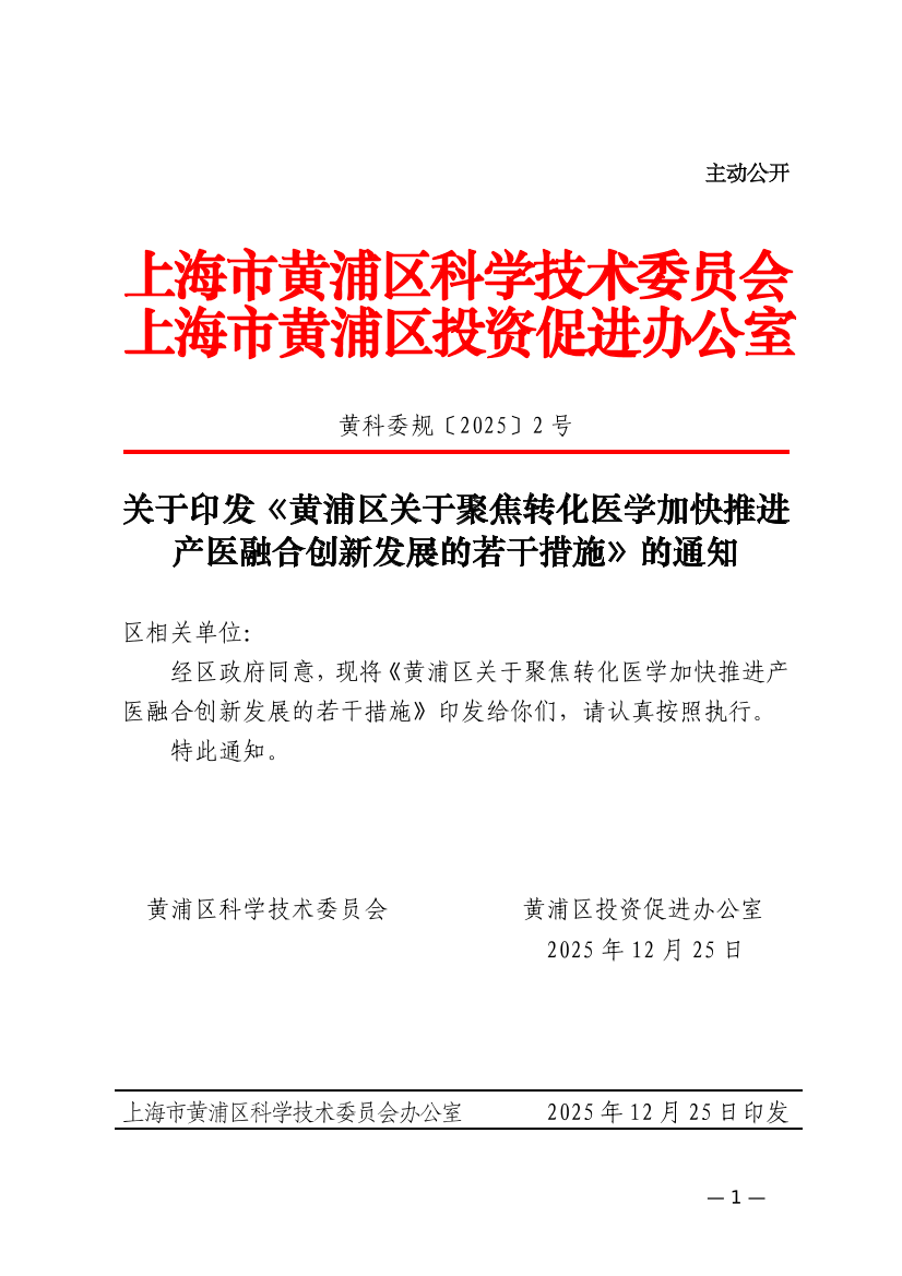 关于印发《黄浦区关于聚焦转化医学加快推进产医融合创新发展的若干措施》的通知