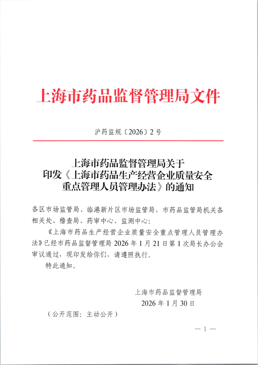 《上海市药品生产经营企业质量安全重点管理人员管理办法》已经市药品监督管理局2026年1月21日第1次局长办公会审议通过,现印发给你们,请遵照执行。