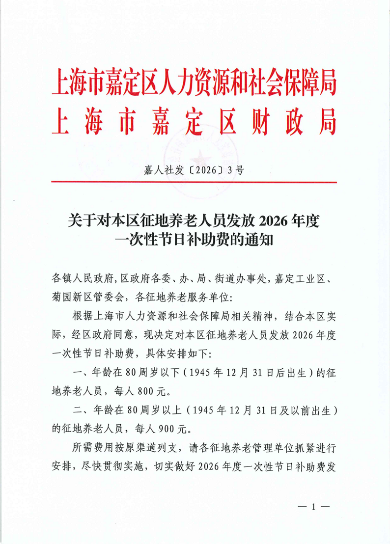 根据上海市人力资源和社会保障局相关精神,结合本区实际,经区政府同意,现决定对本区征地养老人员发放2026年度一次性节日补助费,具体安排如下: