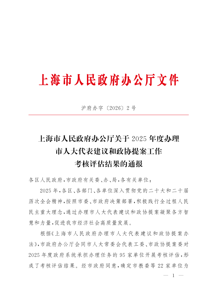 根据《上海市人民政府办理市人大代表建议和政协提案办法》,市政府办公厅会同市人大常委会代表工委、市政协提案委对2025年度政府系统承担办理任务的95家单位开展考核评估,形成了考核评估结果。经市政府同意,确定市教委等22家单位为2025年度办理市人大代表建议和政协提案工作优秀单位,市数据局等25家单位为表扬单位(名单附后)。