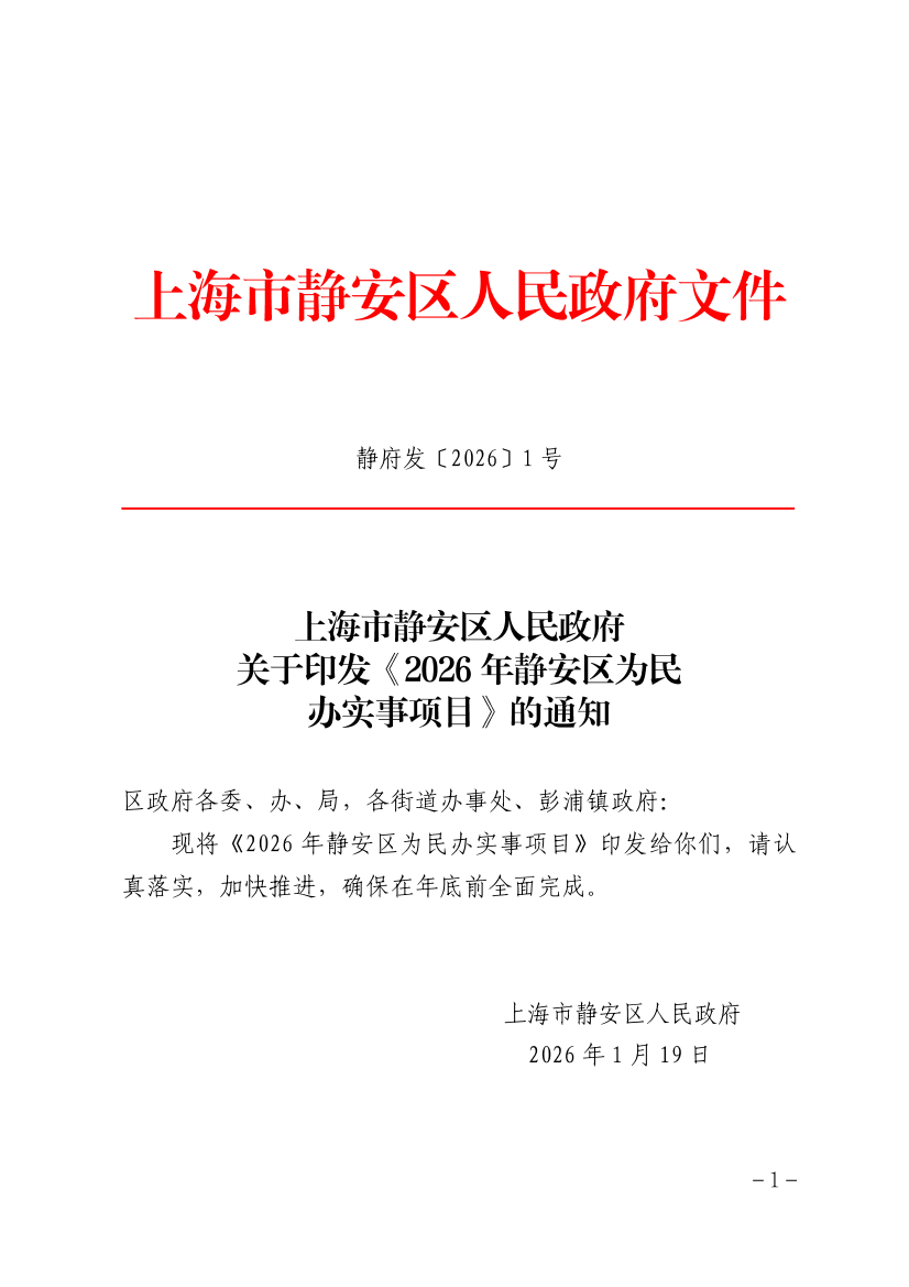 现将《2026年静安区为民办实事项目》印发给你们,请认真落实,加快推进,确保在年底前全面完成。