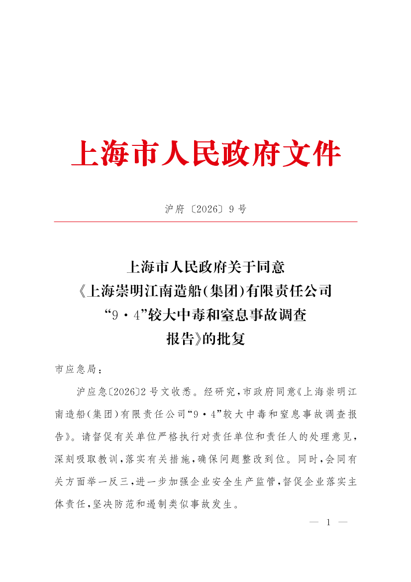 沪应急〔2026〕2号文收悉。经研究,市政府同意《上海崇明江南造船(集团)有限责任公司“9·4”较大中毒和窒息事故调查报告》。请督促有关单位严格执行对责任单位和责任人的处理意见,深刻吸取教训,落实有关措施,确保问题整改到位。同时,会同有关方面举一反三,进一步加强企业安全生产监管,督促企业落实主体责任,坚决防范和遏制类似事故发生。
