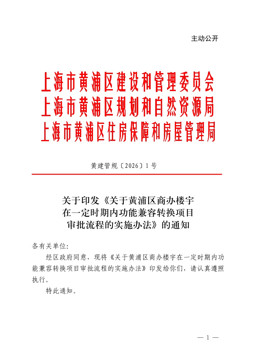 关于印发《关于黄浦区商办楼宇在一定时期内功能兼容转换项目审批流程的实施办法》的通知