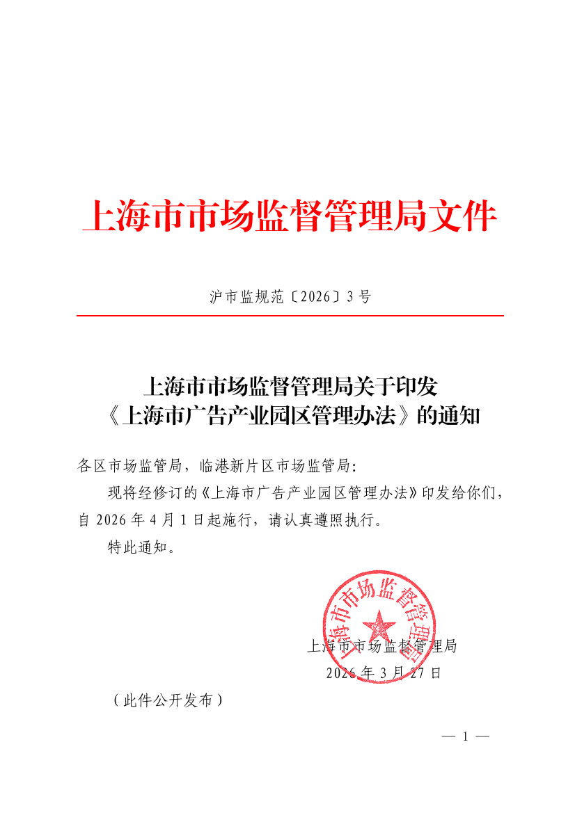 现将经修订的《上海市广告产业园区管理办法》印发给你们,自2026年4月1日起施行,请认真遵照执行。