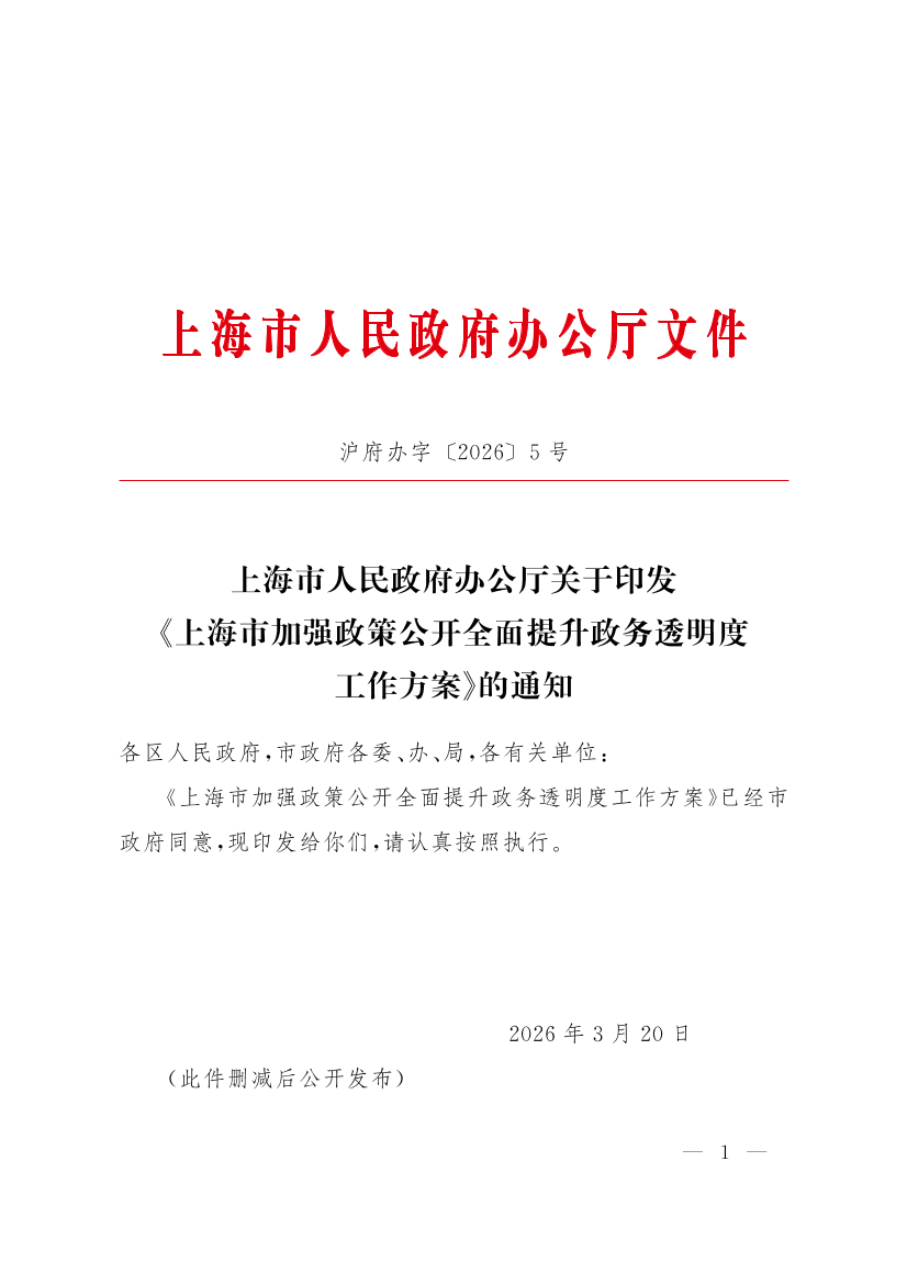 上海市人民政府办公厅关于印发《上海市加强政策公开全面提升政务透明度工作方案》的通知