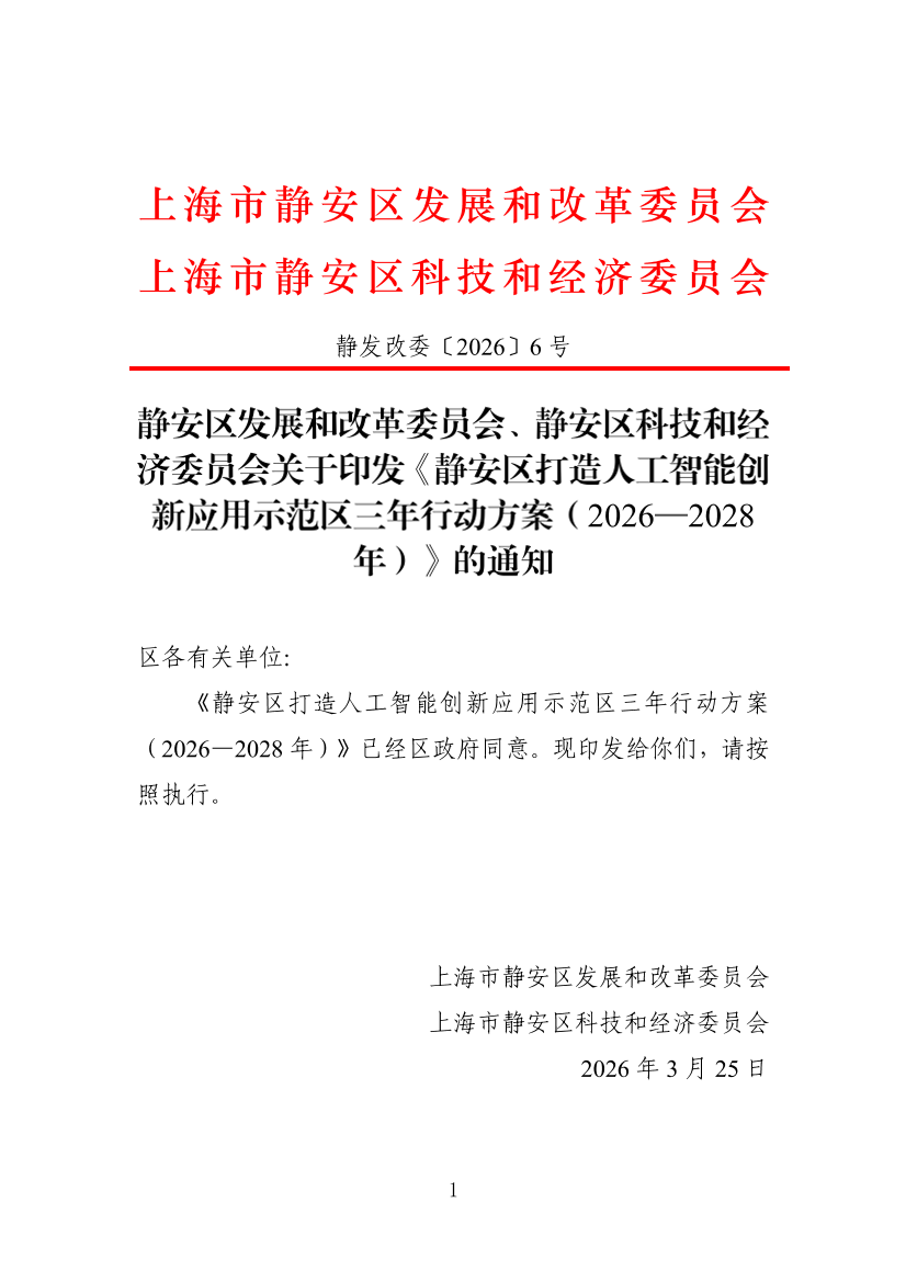 《静安区打造人工智能创新应用示范区三年行动方案(2026—2028年)》已经区政府同意。现印发给你们,请按照执行。