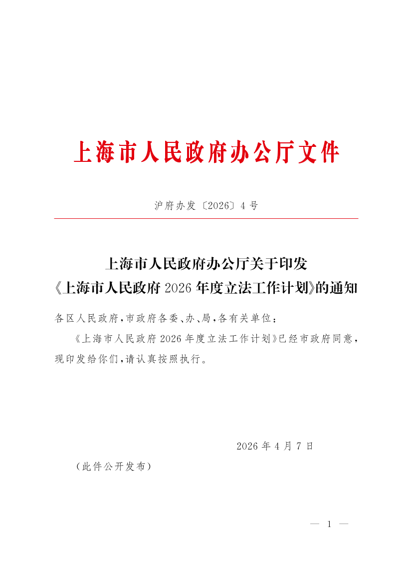 上海市人民政府办公厅关于印发《上海市人民政府2026年度立法工作计划》的通知
