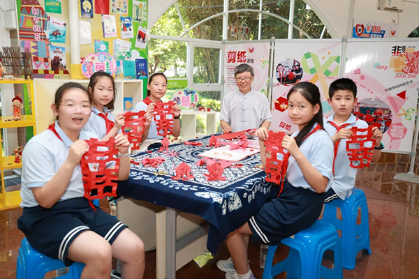 研讨会开始前,在亭林小学中心广场、开放书吧及室内体育馆举行了代际文化体验活动。静态展示区内,展示了彩泥、剪纸、绢花等代际学习成果;动态体验区设置了腰鼓、冰壶、皮筋、抓石子、滚铁环等文化体验活动。