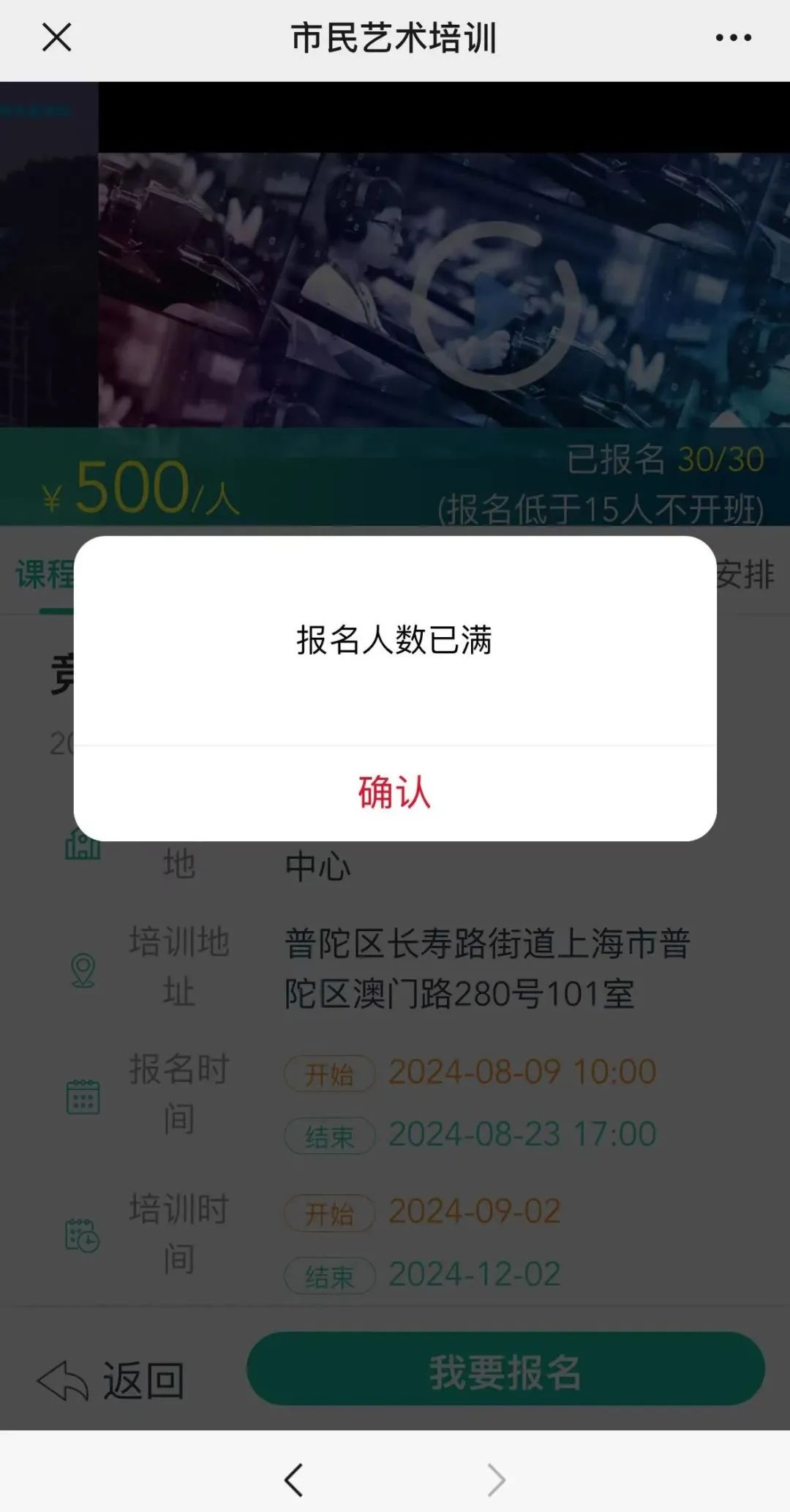 早上10点,市民艺术夜校准时开秒,市民们纷纷涌入报名系统,争相抢报心仪的课程。在极短的时间内,不少热门课程在开放报名后瞬间被秒杀一空。
