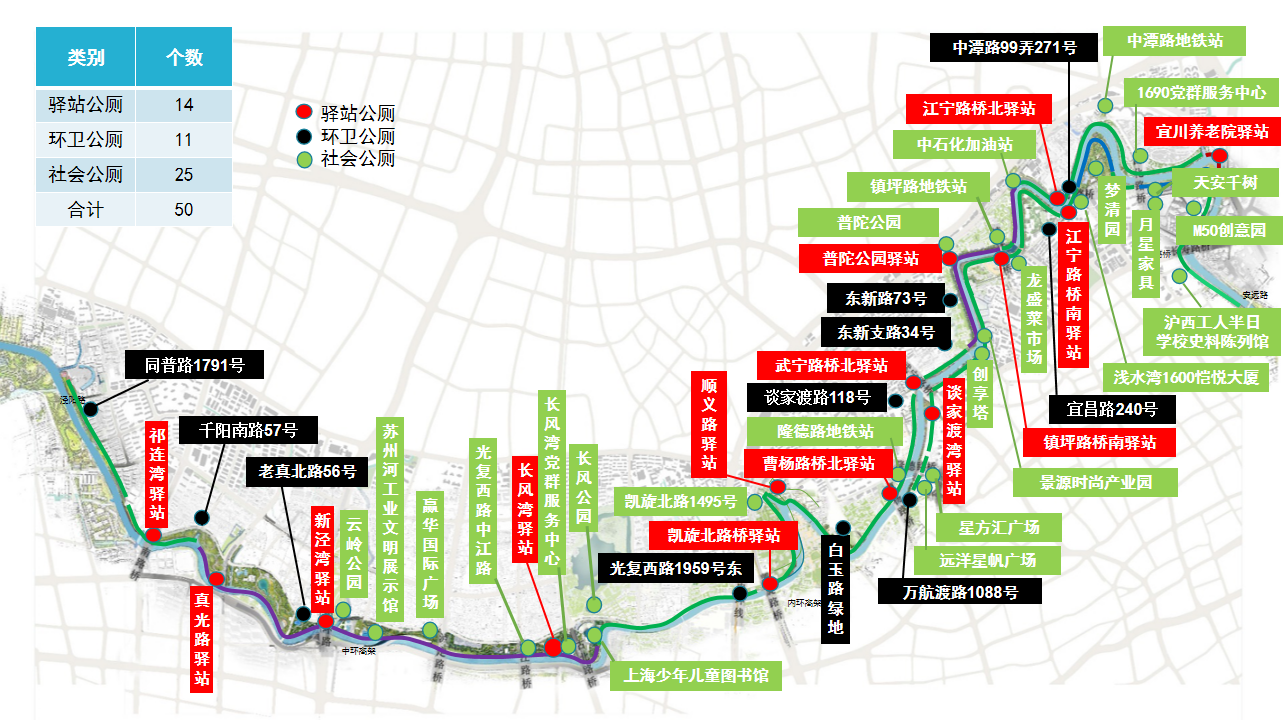普陀区深入调研苏河沿线公厕现状,全面掌握环卫、绿地公园、苏河驿站和社会单位公厕的不同情况,探索推进除环卫公厕外的其他三类公厕对外开放和规范管理。截至目前,普陀区21公里“半马苏河”沿线公厕达到50座,极大地提升了市民如厕便利性。