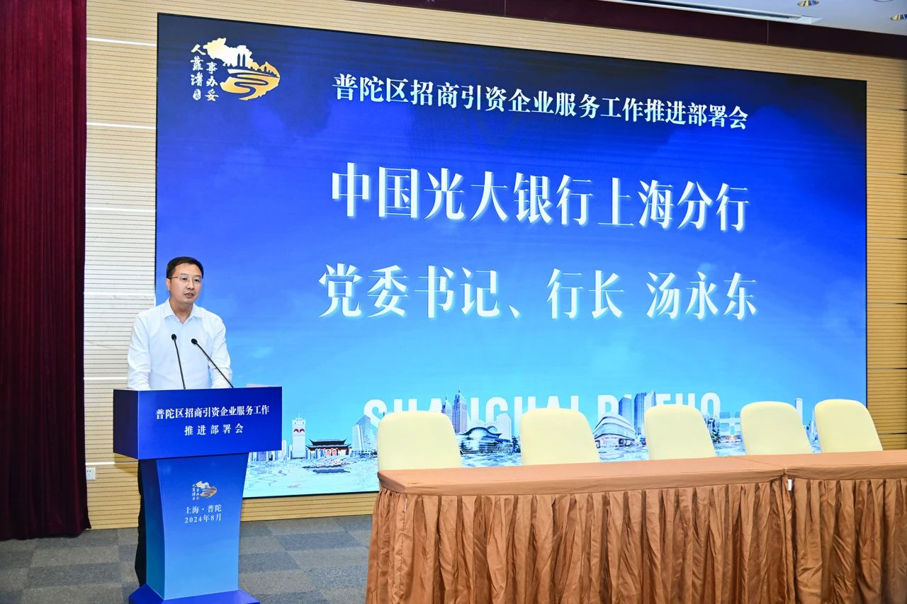 为深入贯彻落实党的二十届三中全会和上海市招商引资企业服务工作推进部署会精神,更好推动普陀高质量发展和现代化建设,8月22日,普陀区招商引资企业服务工作推进部署会举行。中国光大银行上海分行党委书记、行长汤永东,中国光大银行上海分行党委委员、副行长杜奕;普陀区委书记姜冬冬,区委副书记、区长肖文高,区人大常委会主任谈上伟,区政协主席杭春芳,区领导刘东昌、李荣华、张伟、魏静、吴朝阳、厉蕾、蒋龙、周如意、付乐欣出席。