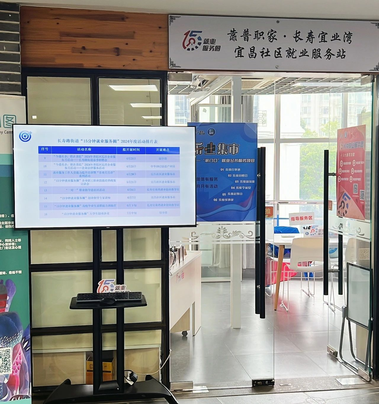 走进苏州河秀带旁的“靠普职家·长寿宜业湾宜昌社区就业服务站”,墙面上张贴着醒目的“15分钟就业服务圈”宣传栏,定期更新就业创业活动信息以及岗位信息。