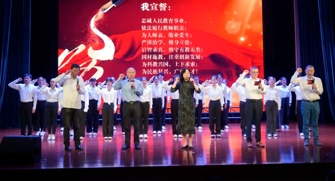 青丝白发,见证悠悠岁月;韶华咫尺,无悔使命初心。五位深耕普陀教坛四十载的荣休老教师代表也来到了活动现场,他们都是正高级教师、上海市特级教师,把全部的青春力量献给了教育事业。他们深情回顾了自己的从教经历,分享了各自的教育理念。师道传承,匠心育人。今年,又一批新教师加入了普陀教育大家庭,接过教育事业的接力棒,大会现场,老教师们带领新教师代表进行了入职宣誓。