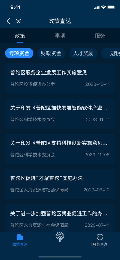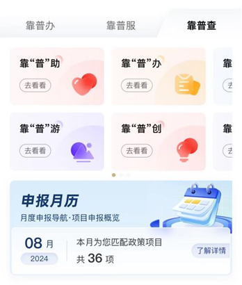 通过用户使用习惯分析,优化改进企业云普陀旗舰店“靠普办”“靠普服”和“靠普查”三大功能板块,升级检索引擎,为用户提供更加直观的视觉体验和更为便捷的使用感受。其中,“靠普查”板块针对办事、购物、住房、金融、出游、求职等领域进行优化重构,设立“靠‘普’助”等,方便企业高效检索各类政策文件,快速锁定所需政策,实现惠企利企政策触手可达。同时,贴心推出政策“申报月历”服务,帮助企业按月查看申报项目信息,了解项目申报时间、扶持力度和适用条件等,并进一步通过政策体检功能,助力企业查验申报条件符合度,提高申报通过率。