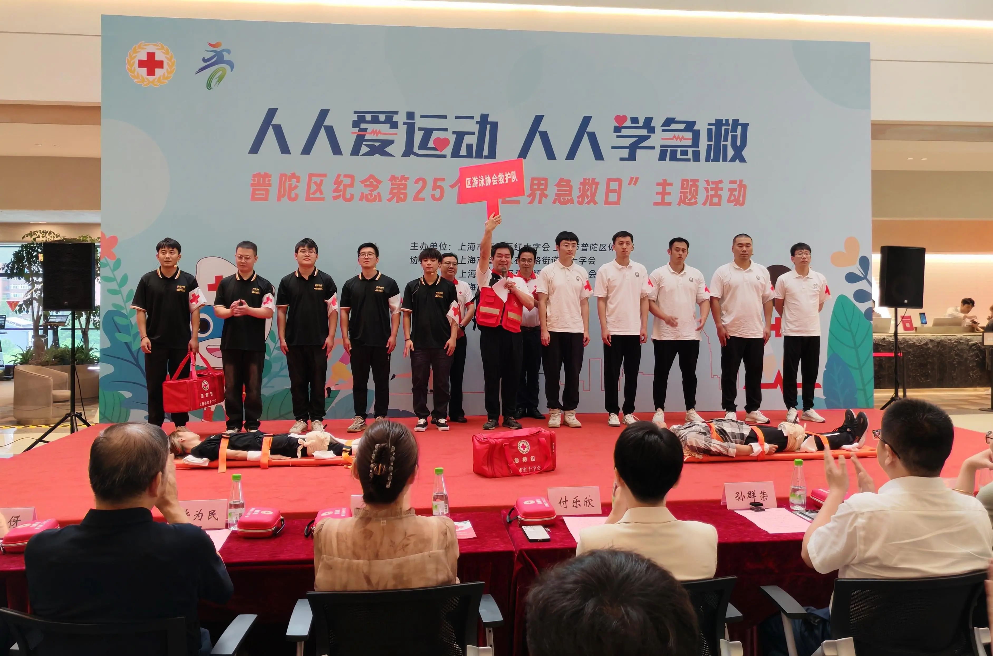 提升体育行业从业人员面对突发意外时的应急救护能力,更好地保障运动员和运动爱好者的生命安全,区红十字会积极推动应急救护技能培训进体育行业。为进一步加强运动场所服务保障功能,守护市民健身安全,实现“红十字‘救’在身边”,普陀体育应急救护志愿服务队正式成立,现场举行了授旗和颁证仪式。
