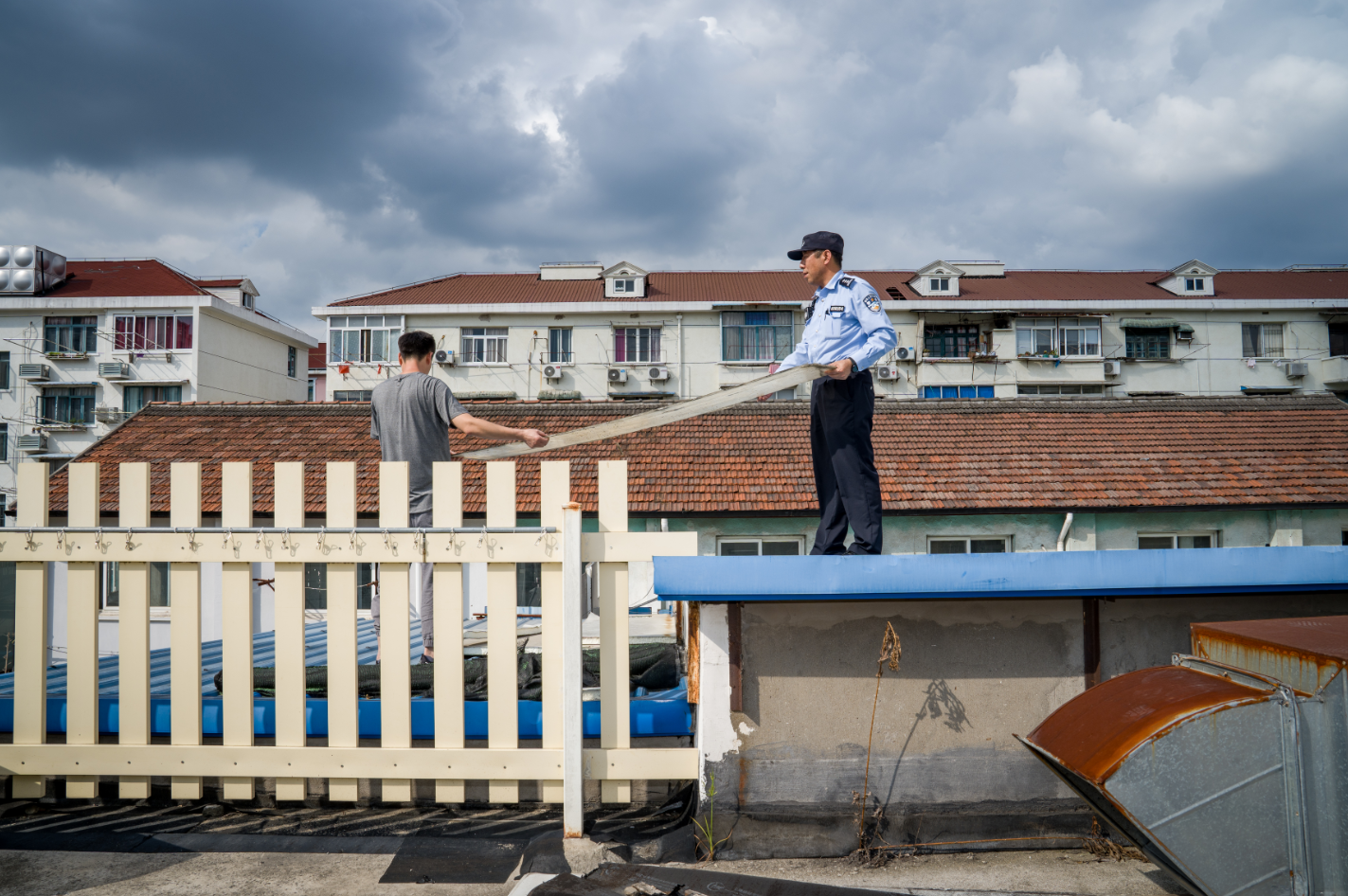 “这些东西散落在屋顶太危险了,我们一起把它们挪到安全的地方。”风雨来临前夕,普陀公安分局白丽路派出所社区民警钱友继至辖区某敬老院内,配合工作人员将院子屋顶上的散落物清除干净。受台风“贝碧嘉”过境影响,本市范围内多处住宅、楼宇受损,阳台及屋顶堆积了各种散落物。为避免散落物被台风“普拉桑”吹落,造成二次灾害,白丽路派出所组织社区民警对辖区居民楼等建筑物楼顶进行全量排查,联合物业、居委及相关工作人员第一时间对杂物进行清理,全力做好应对台风“普拉桑”的准备。