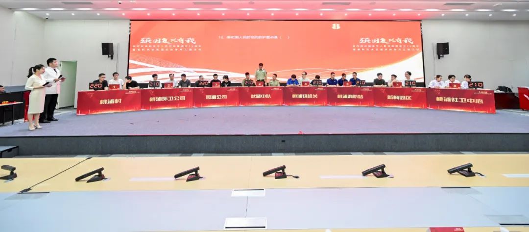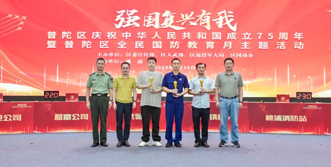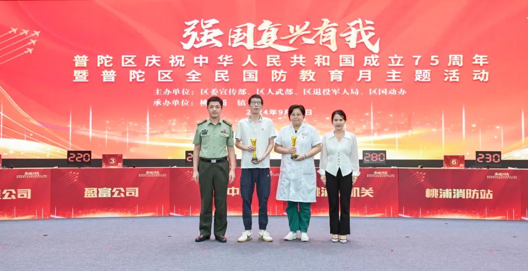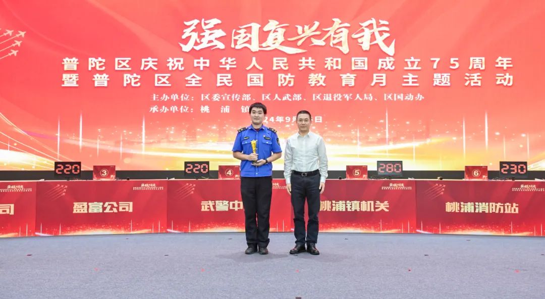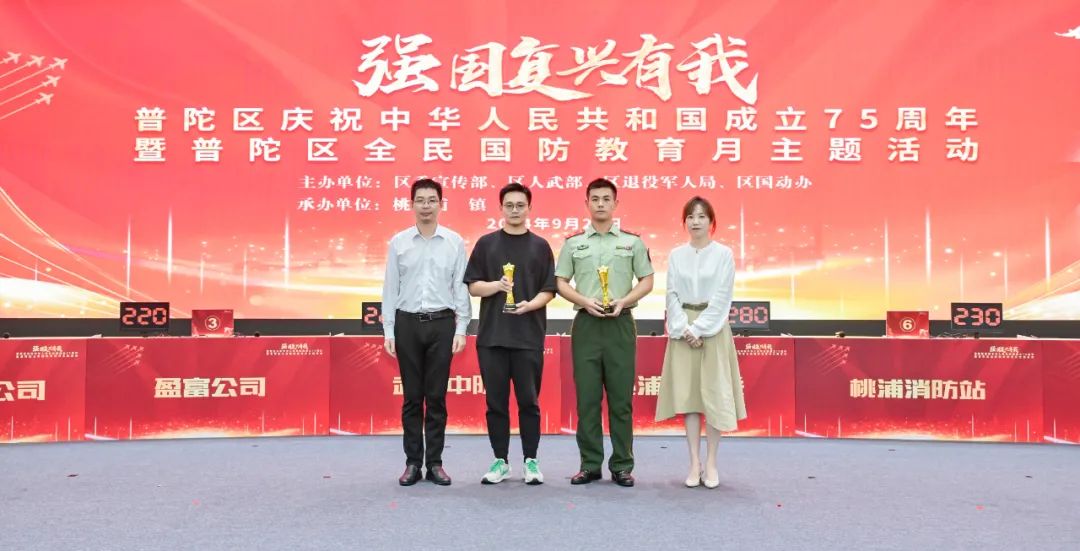 随后,“依法开展国防教育,提升全民国防素养”国防知识竞赛决赛将活动推向高潮。该竞赛于今年9月开赛,创新性地采用了线上线下相结合的方式,吸引镇域单位和众多国防知识爱好者参与。决赛中,题目紧扣《中华人民共和国国防教育法》,围绕学校国防教育、社会国防教育、国防教育保障、法律责任等内容展开,参赛选手们凭借扎实的国防知识功底和敏捷的思维能力,在赛场上大放光彩。经过紧张激烈的比赛,最终,桃浦镇机关荣获一等奖,桃浦村、桃浦社卫中心荣获二等奖,桃浦环卫公司、桃浦消防站、新杨园区荣获三等奖,武警中队、盈富公司荣获优胜奖。与会领导为获奖队伍颁发奖杯。此外,线上国防知识竞赛的成绩也在现场揭晓,50名群众喜获奖励,进一步激发了广大市民参与国防教育的热情。