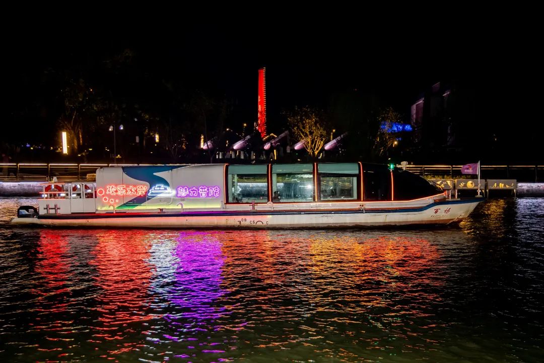 国庆节期间,普陀区联合久事旅游、旅游时报创新推出彩船夜游活动,为“半马苏河”的夜晚增添了一抹亮丽的色彩。4艘装扮有上海旅游节和“半马苏河”文化旅游节相关发光文字和图案的“时光之梭”游船,在夜幕下的长风公园码头和昌化路码头来回穿梭,犹如一条炫彩的荧光飘带,吸引了众多市民游客的目光。同时,苏州河游船夜间航线也正式启航,乘坐着装扮一新的闪光彩船,游客们可以尽情欣赏“半马苏河”两岸的光影舞动,享受独一无二的假日体验。