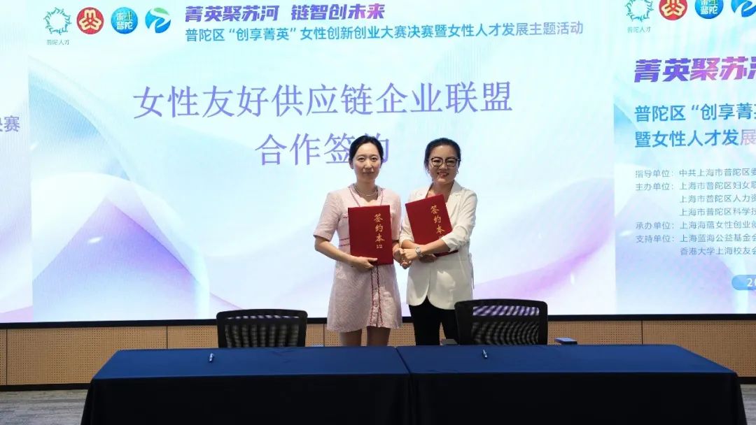 现场,上海市普陀区妇联与江西省九江市妇联共建签约,进一步加强两地妇联组织之间的沟通与协作,共同探索创新妇女工作的方法和途径,推动两地妇女儿童事业的发展。普陀区“女性友好供应链企业联盟”正式成立,将更好地整合资源,为女性创业者们提供全面的支持。现场区内五家企业分别与本次大赛的四个项目达成合作意向,并签订了合作协议。