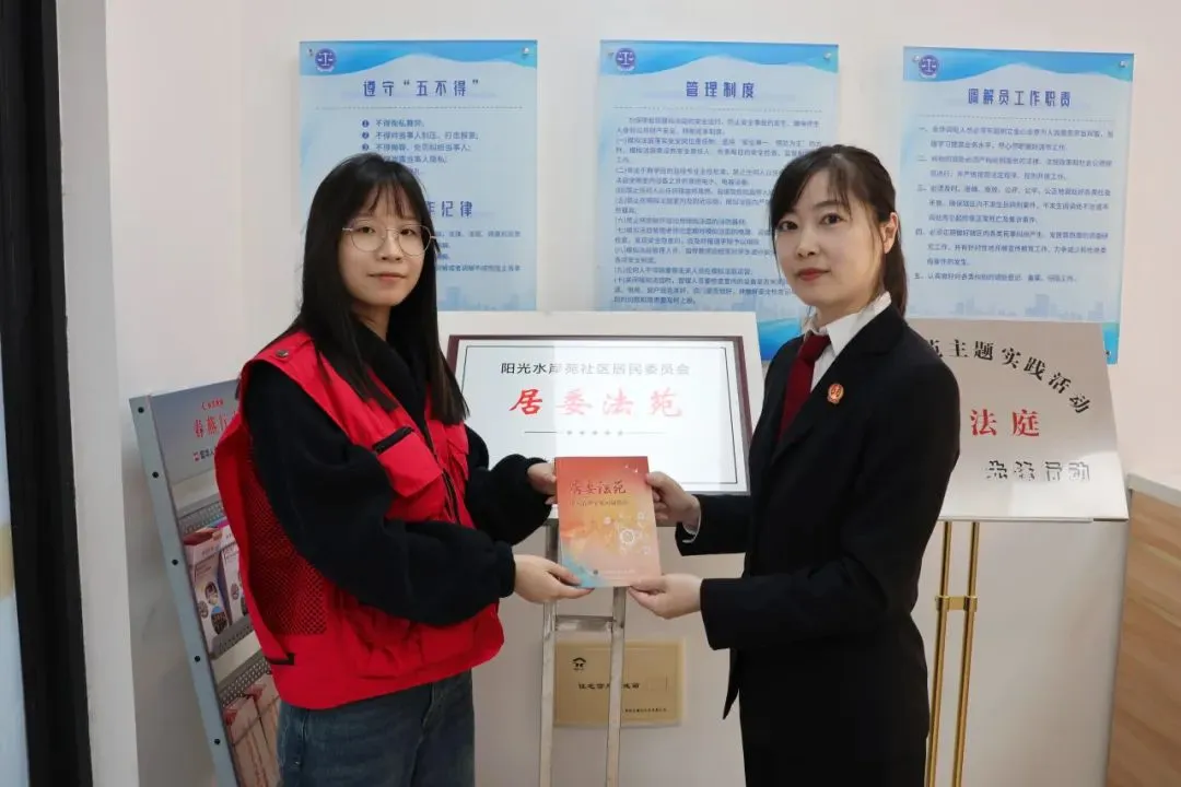 探索数“智”化治理,汇聚多元化赋能,打造“一站式”服务,桃浦镇阳光水岸苑居委法苑正带领居民们走上通向基层治理新格局的“幸福路”。作为上海2024年“美好社区先锋行动”确定的100个市级项目之一,阳光水岸苑坚持减负和增能双向发力,依托“华普治理师”平台,与区委办局、镇职能科室积极对接共建,整合优势资源,着力打造“阳光365”党群服务站,优化“15分钟”社区生活圈,让居民的幸福感、获得感向前“大踏步”。在这座功能全面的党群服务站中,阳光水岸苑居委法苑“模拟法庭”正在基层“减负赋能”实践中发挥着莫大的作用,而其建立则与普陀区探索打造“靠谱解纷体系”的努力密不可分。