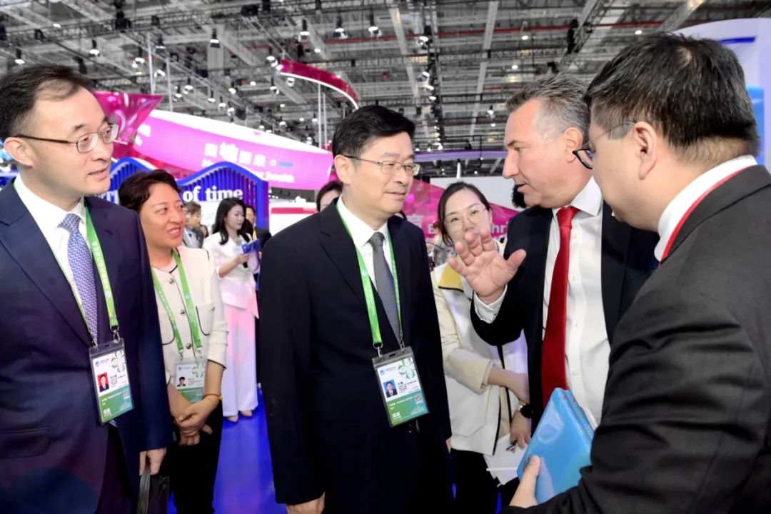 在医疗器械及医药保健展区,于勇走访赛诺菲、辉瑞、礼来、勃林格殷格翰等企业展台,详细了解创新产品、治疗设备以及全病程解决方案等情况,关切询问企业在发展中有哪些问题需要解决。