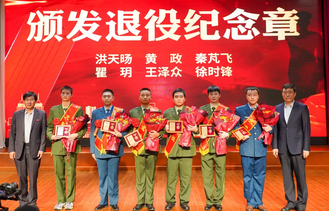 仪式上,18位退役士兵身披绶带、胸前红花映日,光彩夺目。与会领导为他们颁发退役纪念章,这金色的勋章不仅是对他们过往军旅生涯的崇高肯定,更是对他们未来继续投身国家建设、服务人民的深切期许。晋元高级中学的学子们手捧鲜花,向退役士兵们表达了最诚挚的祝福与最高的敬意。