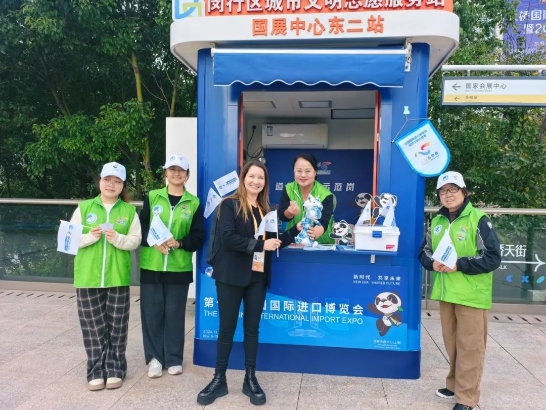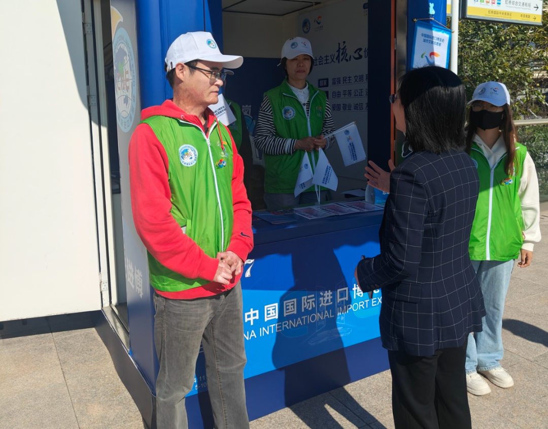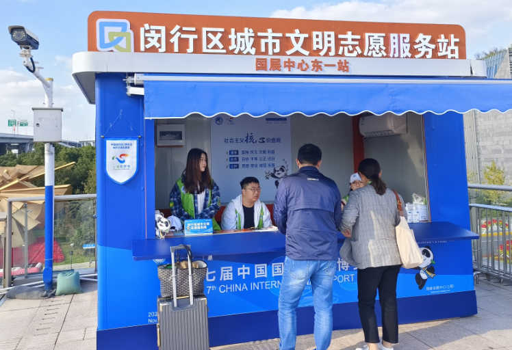 道德典型、文明单位代表分批驻守在国家会展中心东一站、二站城市文明志愿服务岗亭,凭借自身的优秀品质和专业素养,为往来的展商和观展者提供了高质量的文明实践志愿服务。他们以耐心细致的态度为国内外来宾解答疑问、指引方向;用流利的外语为国际友人提供翻译服务,搭建起沟通的桥梁;他们坚守岗位、维护秩序,确保展会顺利进行。他们的专业服务不仅赢得了来宾们的高度赞誉,也展现了闵行的城市文明风采。
