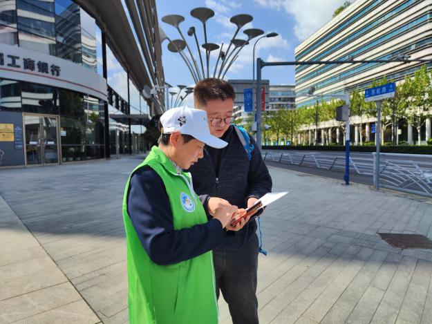 上午8:30,他到达值守点位,比要求的时间点提前了半小时到岗。利用这“多出来的半小时”,他帮助整理、准备志愿者执勤衣物、物资,和志愿者伙伴“复盘”前一天的工作内容。作为一名城市文明志愿者,他负责为路人提供指路、宣传、咨询等服务。