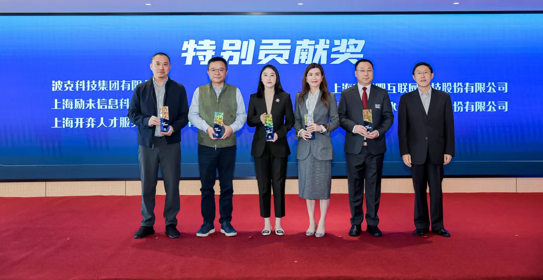 活动现场,波克科技集团有限公司、上海开弈人才服务(集团)有限公司、上海励未信息科技有限公司、上海收钱吧互联网科技股份有限公司、易百信息技术(上海)股份有限公司荣获特别贡献奖。