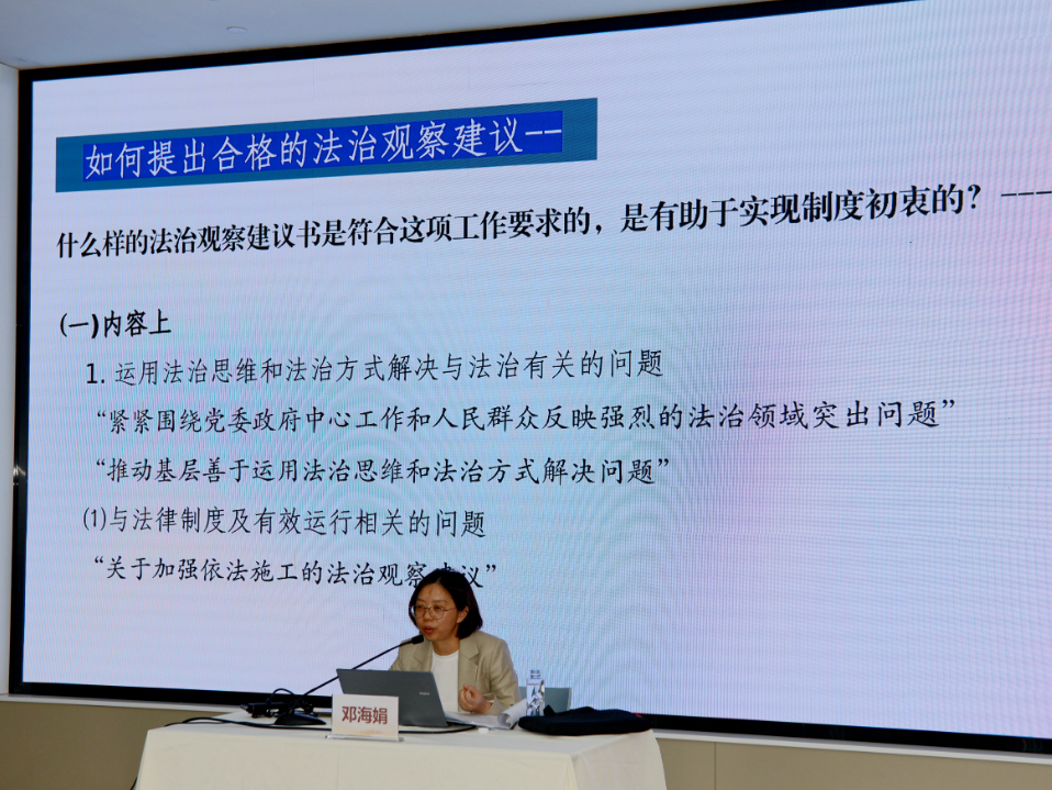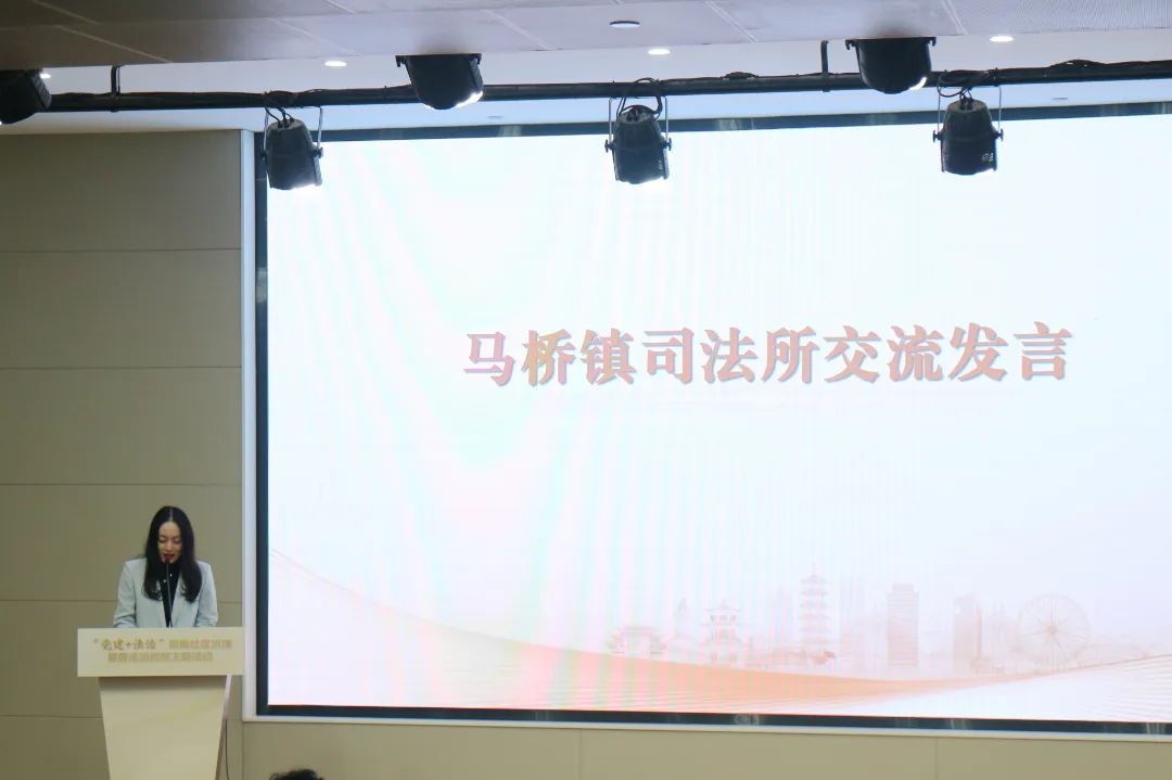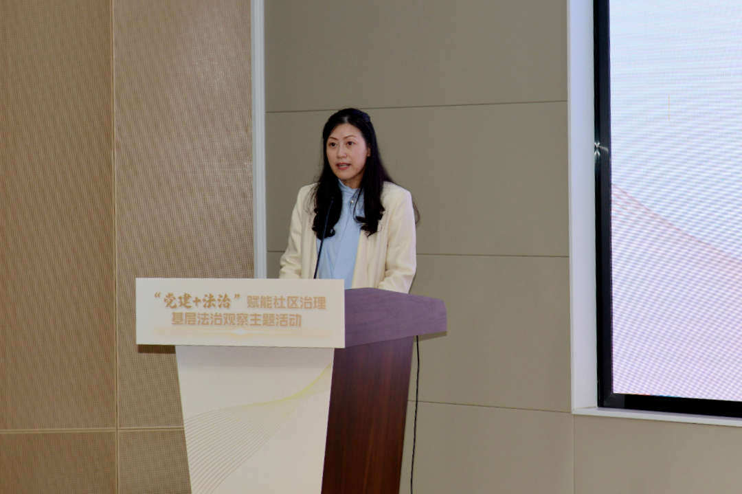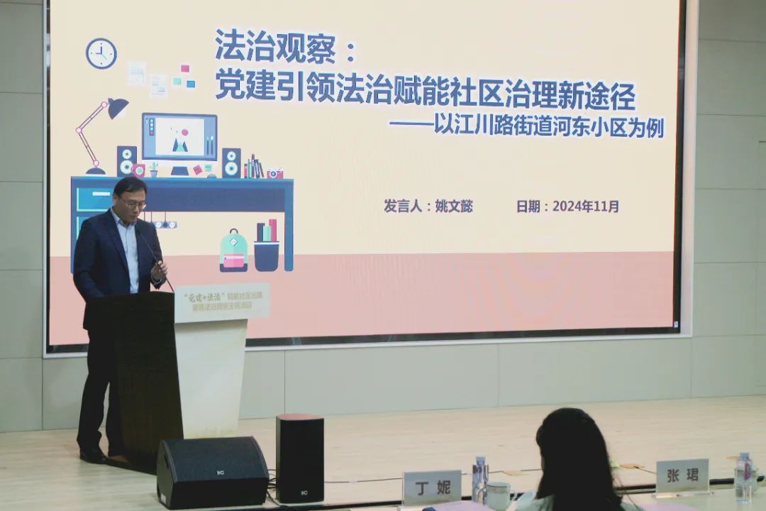 江川路街道社区党群服务中心基层法治观察点代表、街道党工委委员、党群服务中心主任杨翠霞交流发言;江川路街道司法所长姚文懿、马桥镇司法所长龚倩分别围绕老旧小区改造(河东小区)与新型居住单元(新时代城市建设者管理者之家)社区治理交流法治观察建议如何在基层落地落实作主旨演讲。