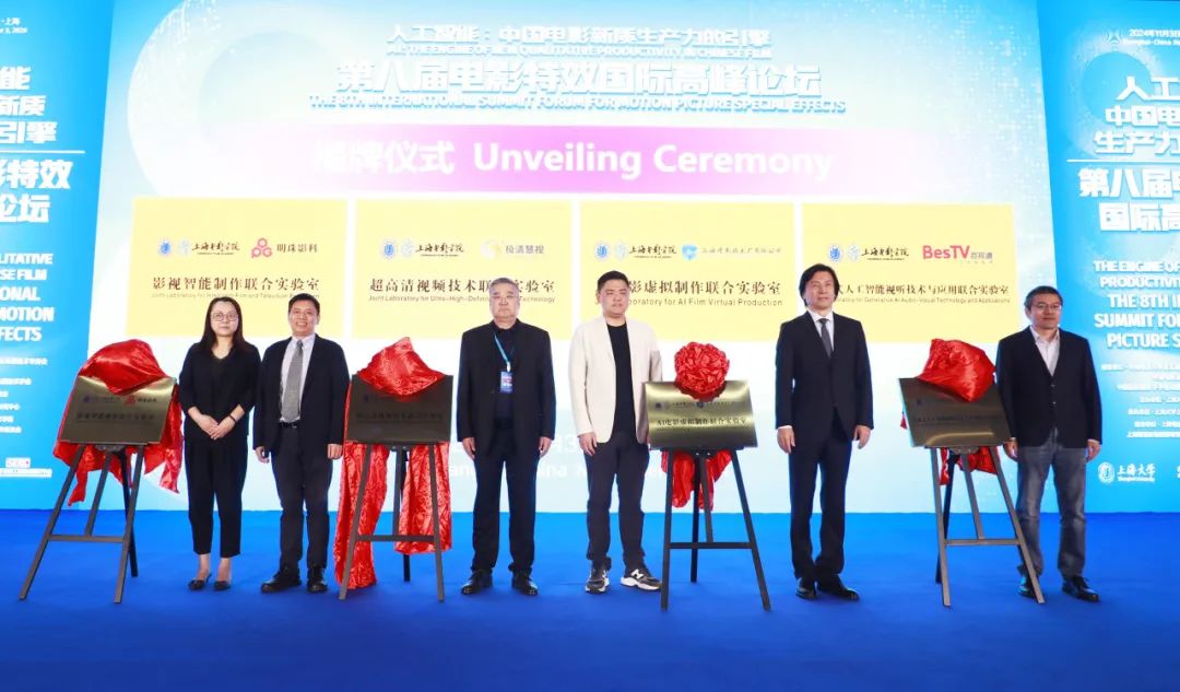 在成旦红、龚波、梅广清等领导的共同见证下,学院与上海电影技术厂有限公司、上海东方明珠影视科技发展有限公司、百视通网络电视技术发展有限责任公司、上海极清慧视科技有限公司举行联合实验室揭牌仪式。
