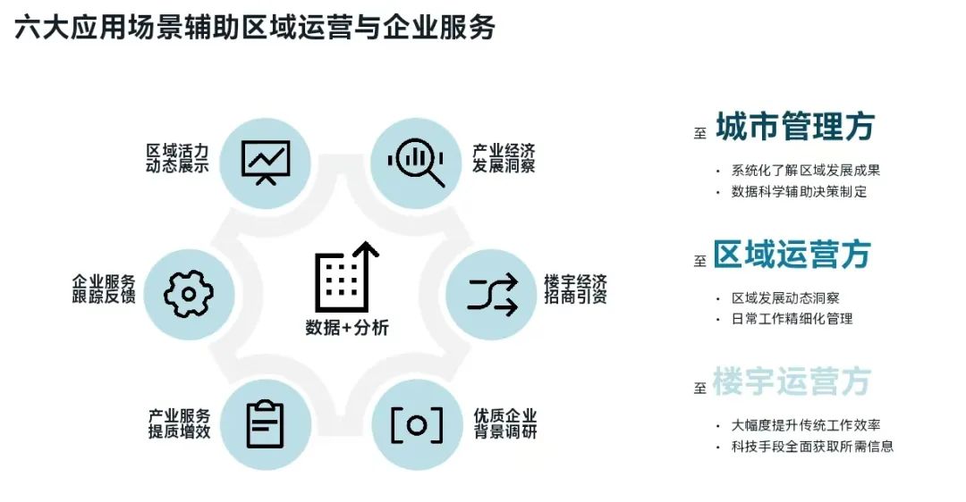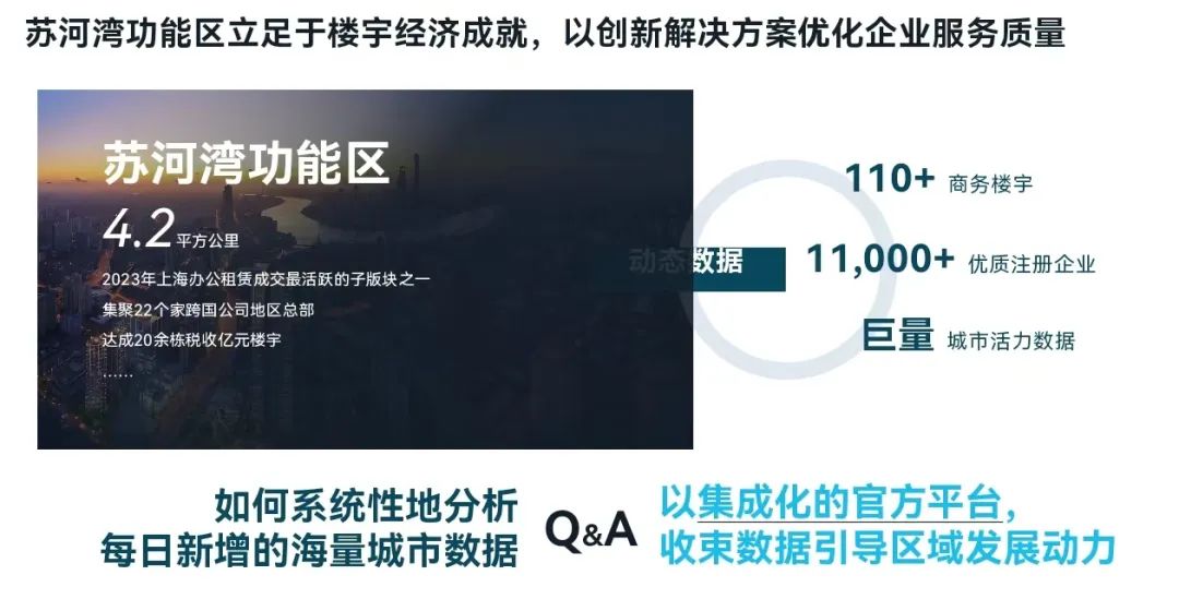 该系统平台涵盖楼宇数据、产经数据、企业数据三维数据底座,覆盖苏河湾功能区180万平方米的优质楼宇载体和约12000家企业数据,并实时高频更刷新。