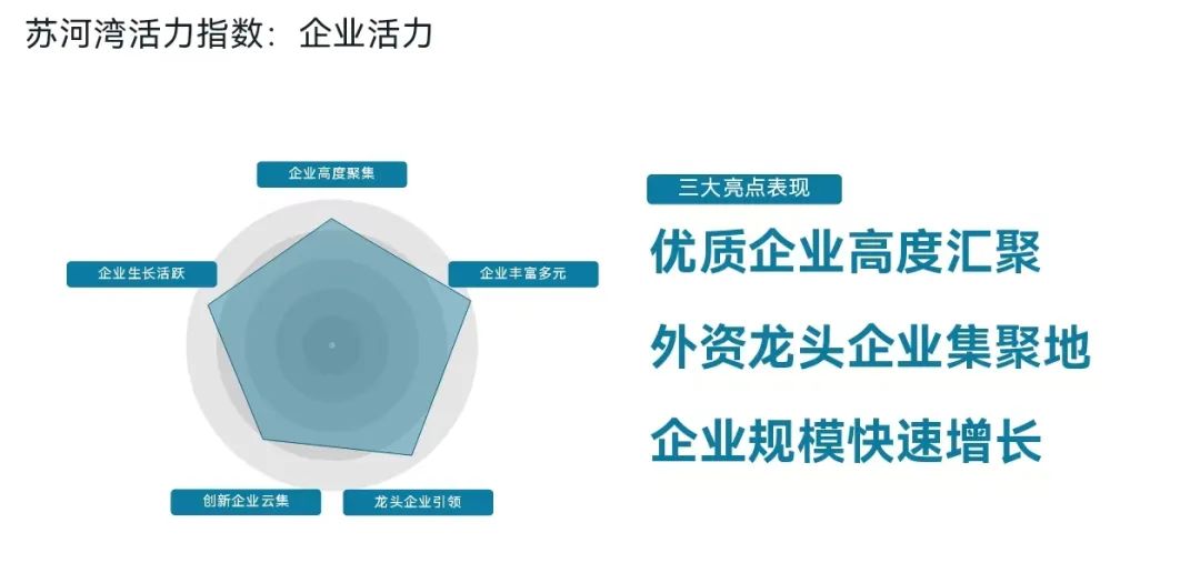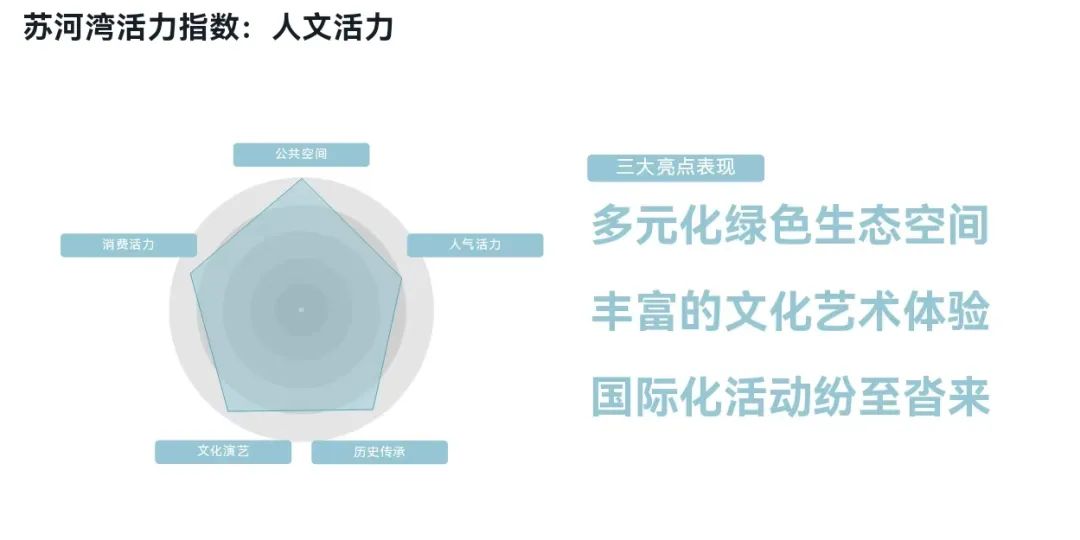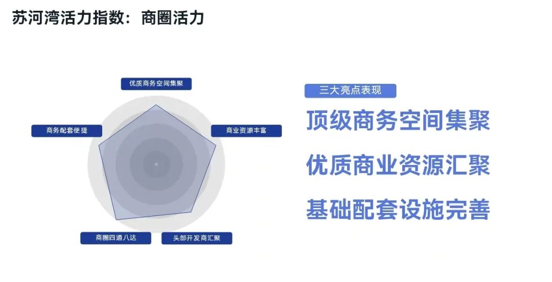 苏河湾在商圈活力、企业活力、人文活力三大维度均具备竞争优势,展现了世界级滨水区活力、创新和开放的独特吸引力,构建了多元融合的优质营商环境。