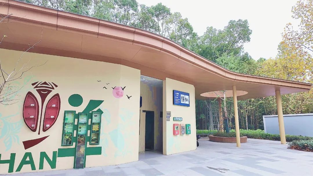 而蝉鸣公厕则“隐于”启动林公园内,硕大的屋顶、亮眼的明黄、童趣的涂鸦……如果不是入口处醒目的蓝色“公共厕所”标识,很难发现它是一座公厕。除了一般公厕贴心配置外,这座公厕还是一家主题公厕,以展现上海特有的蒙古寒蝉、蟪蛄和黑蚱蝉三种蝉为主题,入口处以孩子们视角打造的三款播放器,轻轻按下便可以模拟出不同品种蝉的叫声。