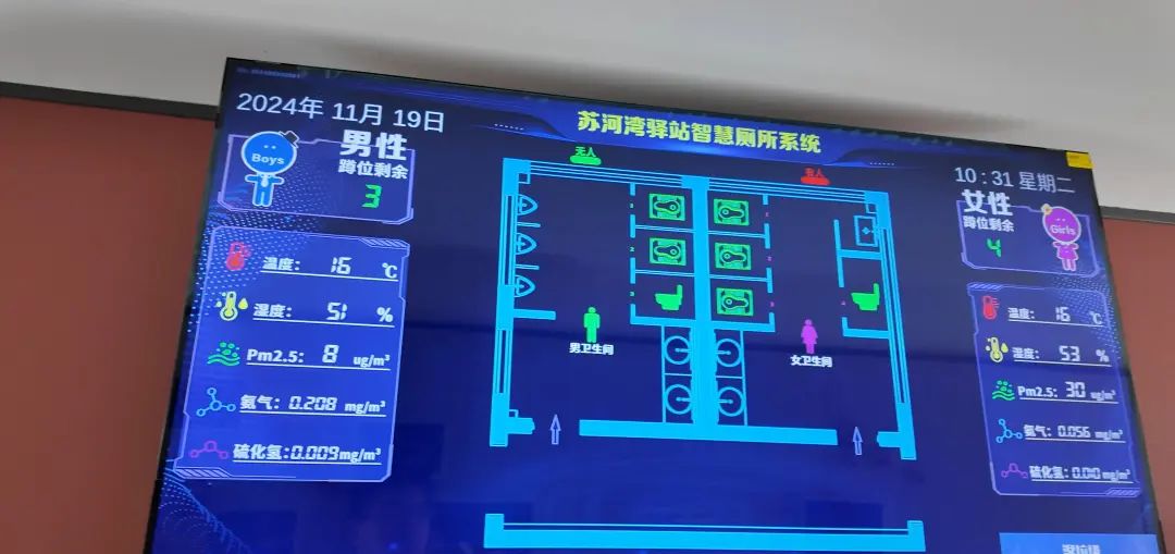 长风湾驿站公厕位于半马苏河公园2号绿地游艇码头旁,外形是新古典主义风格建筑,24小时对市民开放。厕所内智慧平台系统对公厕内部的空气质量、温湿度、蹲位使用情况、客流量等指标数据进行实时监测并显示,让使用者和管理者都能对公厕运行情况一目了然。智能节水装置、采光结构设计、内部环保装饰材料的整体运用,进一步降低能耗,践行绿色低碳的理念。