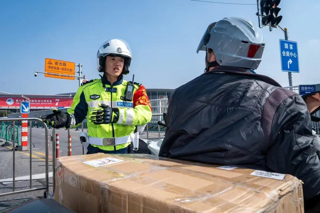在严格做好道路安检的同时,增援的民警们还急市民所急,受到了百姓的点赞。11月5日下午,分局进博会增援警队交警支队民警徐思聪、杨彦君在盈港东路蟠秀路路口执勤时,接到一名焦急万分的外省来沪参会人员张女士求助:“警察同志,请问你们可以帮帮我吗?”两位民警经过询问后得知,原来,张女士所在的交易团当晚要在上海虹桥某会场召开重要商贸会议,但由于飞机航班延误无法按时赶到会场。同时,由于场馆周边的车辆限流等客观因素,预约接送的车辆也无法抵达。“放心,你上我的车,我们带你去!”了解情况后,徐思聪和杨彦君高度重视,第一时间将情况上报,并驾驶警车带上张女士朝着会场驶去。最终,在民警的暖心相助下,张女士按时赶到了会场参加会议,而民警热心细致的工作也受到了该外省交易团的一致好评。