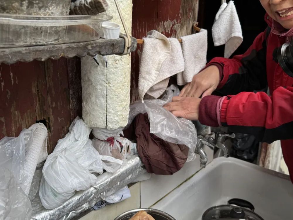 提到弄堂里的冬天,周冬妹有太多心酸的麻烦事。不仅做饭、居住等生活条件简陋、诸多不便,还有许多令人崩溃的小事。比如,冬天一到,洗澡冷,晒衣服也没光照,“周围被高楼包围着,外面阳光再好,我们这里是没有阳光进来的。”而且室外洗菜池的自来水管还容易冻裂,为此,夫妇俩绞尽脑汁想尽了各种办法:给水管紧紧裹上冬天外卖包装同款保温棉,还买来暖宝宝贴上,再缠上毛巾、套上泡沫箱,里外三层紧紧包裹,水管终于“暖和”了。