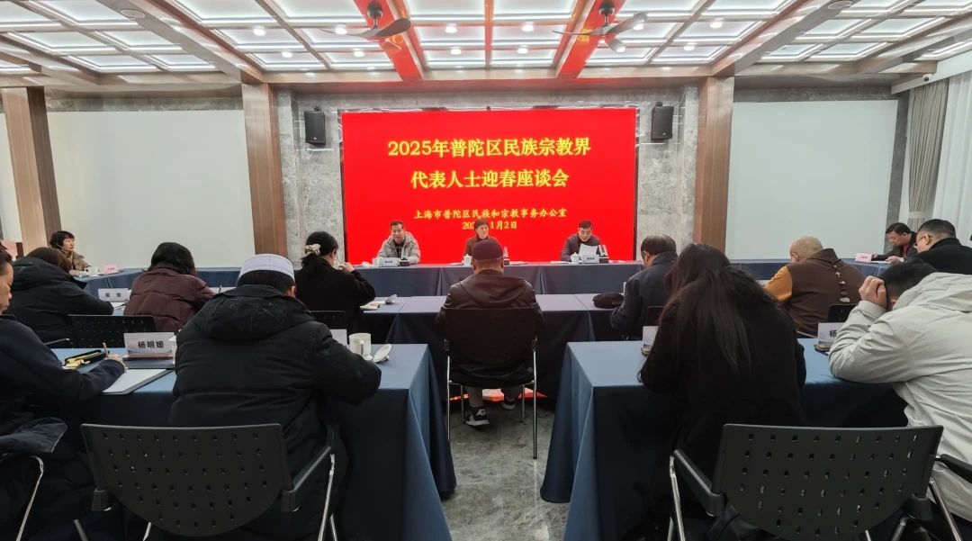 日前,普陀区举办2025年民族宗教界代表人士迎春座谈会。区委常委、统战部部长魏静出席会议并讲话,区委统战部副部长、区民宗办主任蒲雪峰,区民族联领导班子,区民族团结进步教育基地、区宗教团体、区宗教活动场所相关负责人,区政协民族宗教界别委员及少数民族“两支队伍”代表等40余人参加会议。