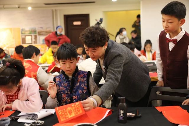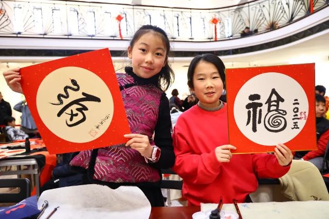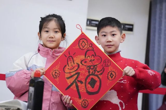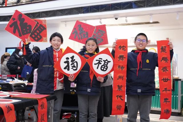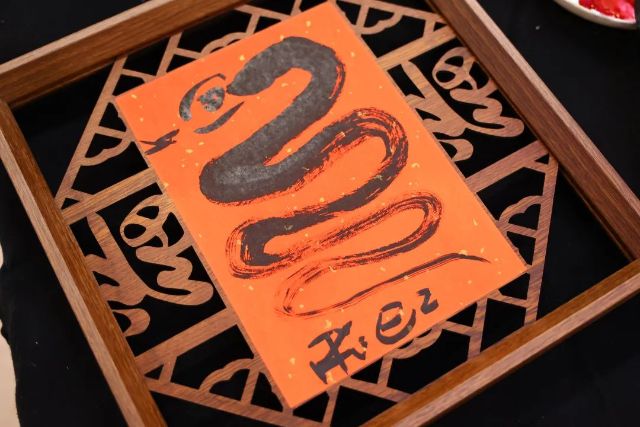 当天讲座后,学生们还与书画名家一同挥毫泼墨,共同创作最美的蛇年新作。隶书、楷书、草书、小篆……孩子们兴致勃勃,手中的毛笔行云流水。笔锋间,象征着好运与吉祥的“福”字在宣纸上缓缓展现,逐渐呈现出一幅幅充满活力与创意的画作。孩子们将自己书写的作品赠送给现场观众,新春的祝福与美好愿望在彼此间传递,浓浓的年味蔓延开来。