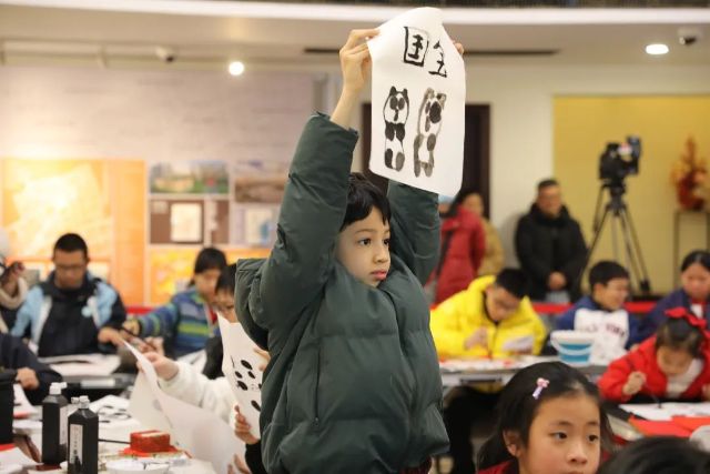 大厅里,来自上海中国画院的画师庞飞开启了“小小书画家培育计划”《中国书画创作》名家微讲堂的第一讲。他手持毛笔,在宣纸上轻点、勾勒,不一会儿,一只憨态可掬的熊猫雏形便呈现在众人眼前。“大家记住了没有?画一个熊猫要画8个点,然后打上圈圈。”他的声音温和而富有感染力,孩子们围坐在四周,全神贯注地看着老师的每一个动作,生怕错过任何一个细节。深入浅出的讲解,让现场的孩子们更好地理解中国书画的独特魅力与艺术内涵,在老师的指导下,一个个活泼可爱的“国宝”跃然纸上。