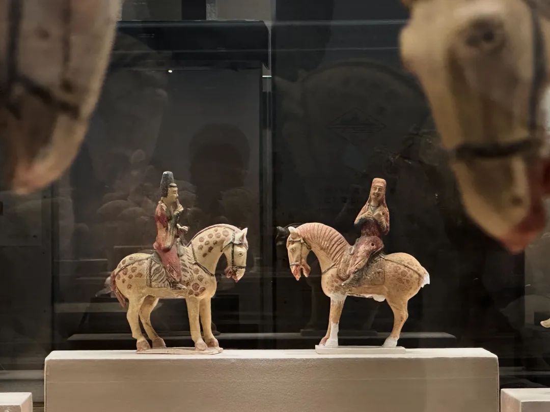 展览布置尽显巧思。观展动线优化后,原出口变为进口,展览期间,还将举办8场唐代风格的室内乐音乐会,乐手身着唐代服饰、化上唐妆演奏,带领观众沉浸式感受唐文化魅力。入口处的昭陵六骏艺术装置尤为吸睛,原件藏于西安碑林博物馆,另有两件于1914年被盗,现藏美国宾夕法尼亚大学博物馆,此次展出的复制件高度还原,引发人们对文物保护与回归的思考。