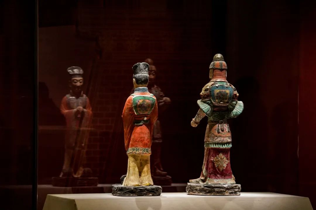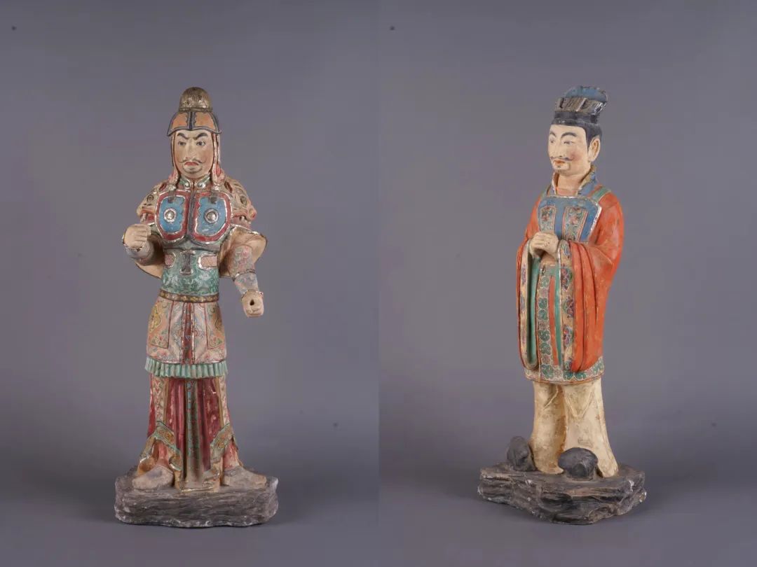 出土于张士贵墓。武官与文官俑皆采用了当时极具代表性的贴金彩绘的制作工艺,做工精细,形象逼真,栩栩如生。服饰的样式、色彩的搭配及人物的气质均注入了当时社会流行风尚的诸多元素,体现出自信、豪迈的大唐气质。武官身穿红色战袍,着明光铠。明光铠最晚在三国时期已经出现,《唐六典》中列出唐代铠甲13种,明光铠排名第一,为将士首选。头戴黑色贴金进贤冠,上身穿朱红色对襟阔袖长衫,下身着乳白色裳。进贤冠也叫“梁冠”,是古代官员朝见皇帝时所戴的一种礼帽,唐时百官皆戴进贤冠。