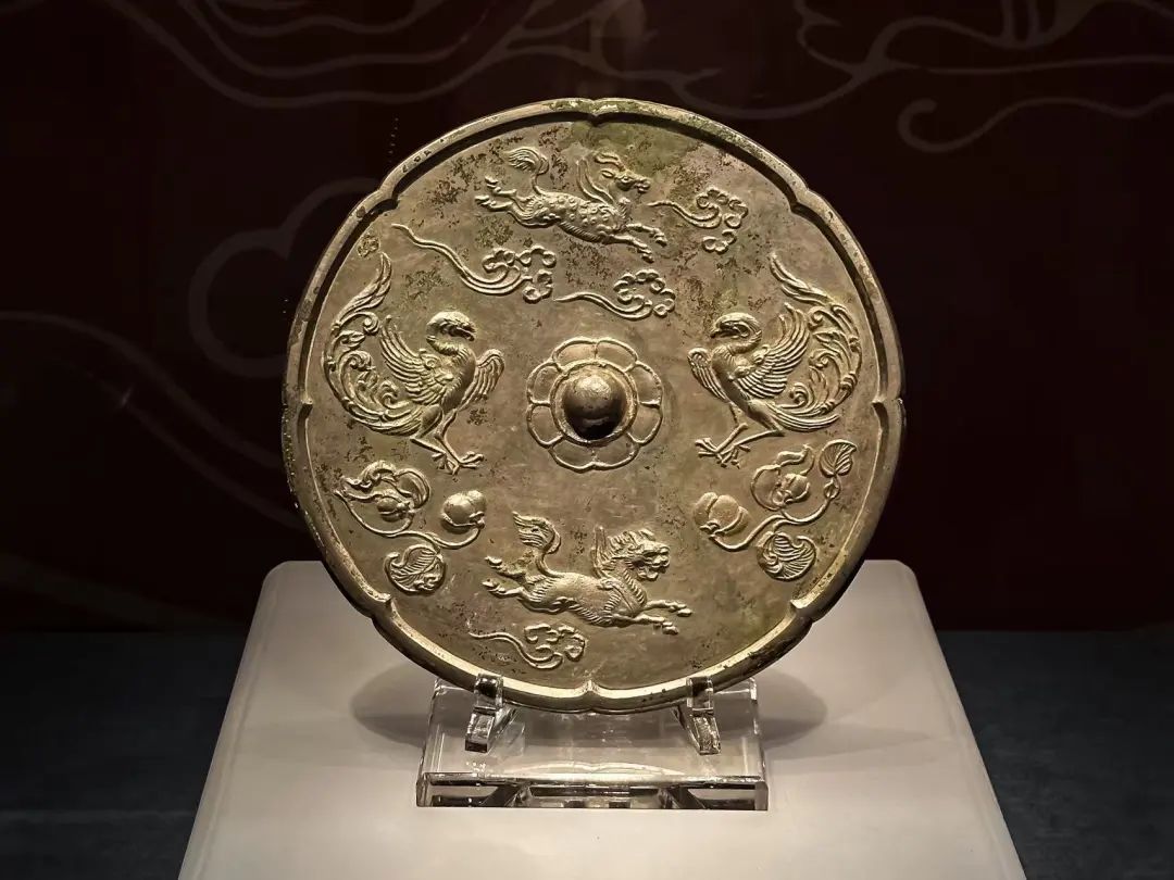 葵边鸾兽铜镜,边缘作葵叶形,镜背面铸有鸾凤和神兽,鸾凤展翅欲飞,极富动感;海兽葡萄纹镜,铜镜整体呈黑漆色,图案装饰繁复、层次分明,是唐代铜镜的代表之作。此外,展览还设置文学馆十八学士、凌烟阁二十四功臣相关内容,呈现贞观年间人才辈出的文化盛景。