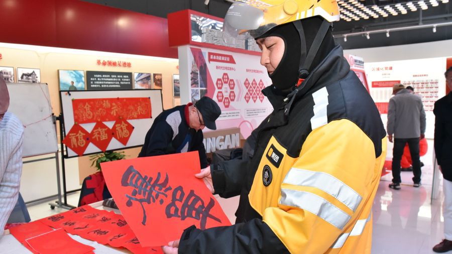 活动现场洋溢着热烈欢快的氛围,书画家志愿者们笔走龙蛇,尽情挥毫泼墨。一幅幅饱含墨香的春联与一个个大红福字跃然纸上。这些满载新春祝愿与美好期许的作品,被他们递到新业态新就业群体以及户外职工的手中,传递着浓浓的温情。