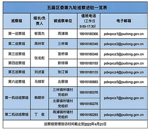 本轮巡察自2月上旬至4月下旬。巡察期间,区委巡察组设专用值班电话和电子邮箱,主要受理反映被巡察镇领导班子及其成员、下一级党组织主要负责人和重点岗位人员问题的来信来电来访,重点是关于违反政治纪律、组织纪律、廉洁纪律、群众纪律、工作纪律和生活纪律以及巡察整改等方面问题反映。其他不属于巡察受理范围的问题,将按规定移交被巡察单位或有关部门处理。巡察组受理信访时间截止到2025年4月21日。