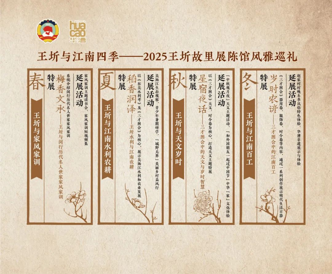 梅香文承、稻香润泽、星宿夜话、岁时农谚——这是2025“王圻与江南四季”风雅巡礼的四季主题,以王圻家风、天文岁时、江南百工等为底蕴,与今时家庭文明、生态文明、文化自信等主题融合诠释,推出特展、研学、讲座、采风等文化项目。