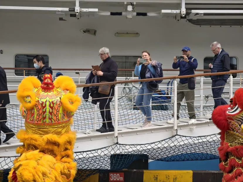 宝山作为上海国际邮轮旅游入境的东道主,为这些来自德国、英国、美国等多个国家的国际邮轮游客精心准备了极具中国特色的欢迎活动,活动在舞龙舞狮的表演中拉开序幕,演员们在鼓乐的伴奏下,默契配合,将龙与狮的灵性与活力完美地呈现在游客面前,吸引大批国际游客驻足拍照留念;到达大厅里的吴淞面塑、蔡氏剪纸、月浦竹编等非遗展示体验等特色活动,更是为国际游客呈现了原汁原味的中国特色文化。