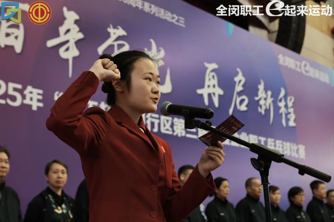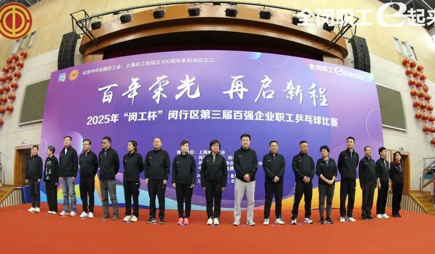 领导和嘉宾为2025年“闵工杯”闵行区第三届百强企业职工乒乓球比赛开球