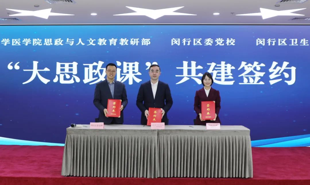 交大医学院党委常委、宣传部部长、思政与人文教育教研部办公室主任康力,闵行区委党校常务副校长马健,闵行区卫生健康工作党委书记赵艳代表三方就“大思政课”建设正式签约。